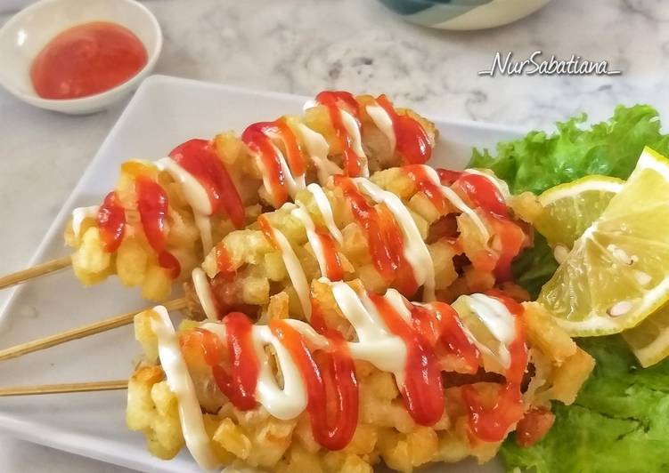 - Ambil 1 tusuk sosis. Celupkan ke dalam adonan pencelup hingga rata. Gulingkan ke dalam potongan french fries sambil ditekan-tekan dan dirapikan agar menutupi seluruh permukaannya. Ulangi langkah ini hingga semua sosis dan adonan habis.